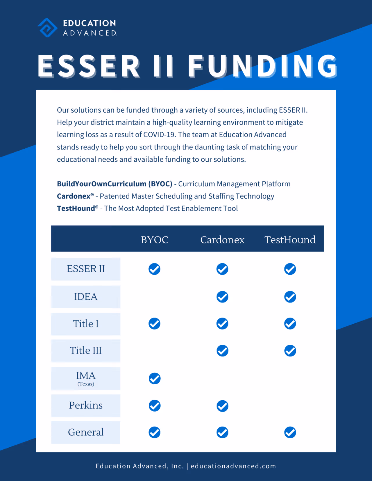 Our solutions can be funded through ESSER to help your district maintain a high-quality learning environment to mitigate learning loss as a result of COVID-19. The team at Education Advanced stands ready to help you sort through the daunting task of matching your educational needs and available funding to our solutions.